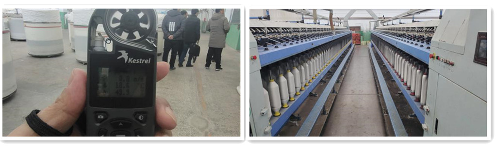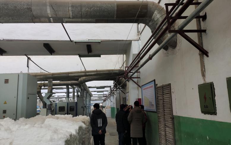 通过现场调研,对车间局部区域飞花多、相对湿度低、滤尘风直接由落地侧墙百叶窗吹向车间、风速高导致二次扬尘等实际运行情况进行仔细查看。我公司樊建彬院长、王宏伟所长结合生产现状进行剖析,并就厂房窗的密封性、车间地面残缺修补和空调实际运行状态调整、滤尘风合理回用、利用细纱热能转移前纺提温加湿、并粗车间增设空调等和企业相关人员进行探讨交流,并提出了改进措施方案。