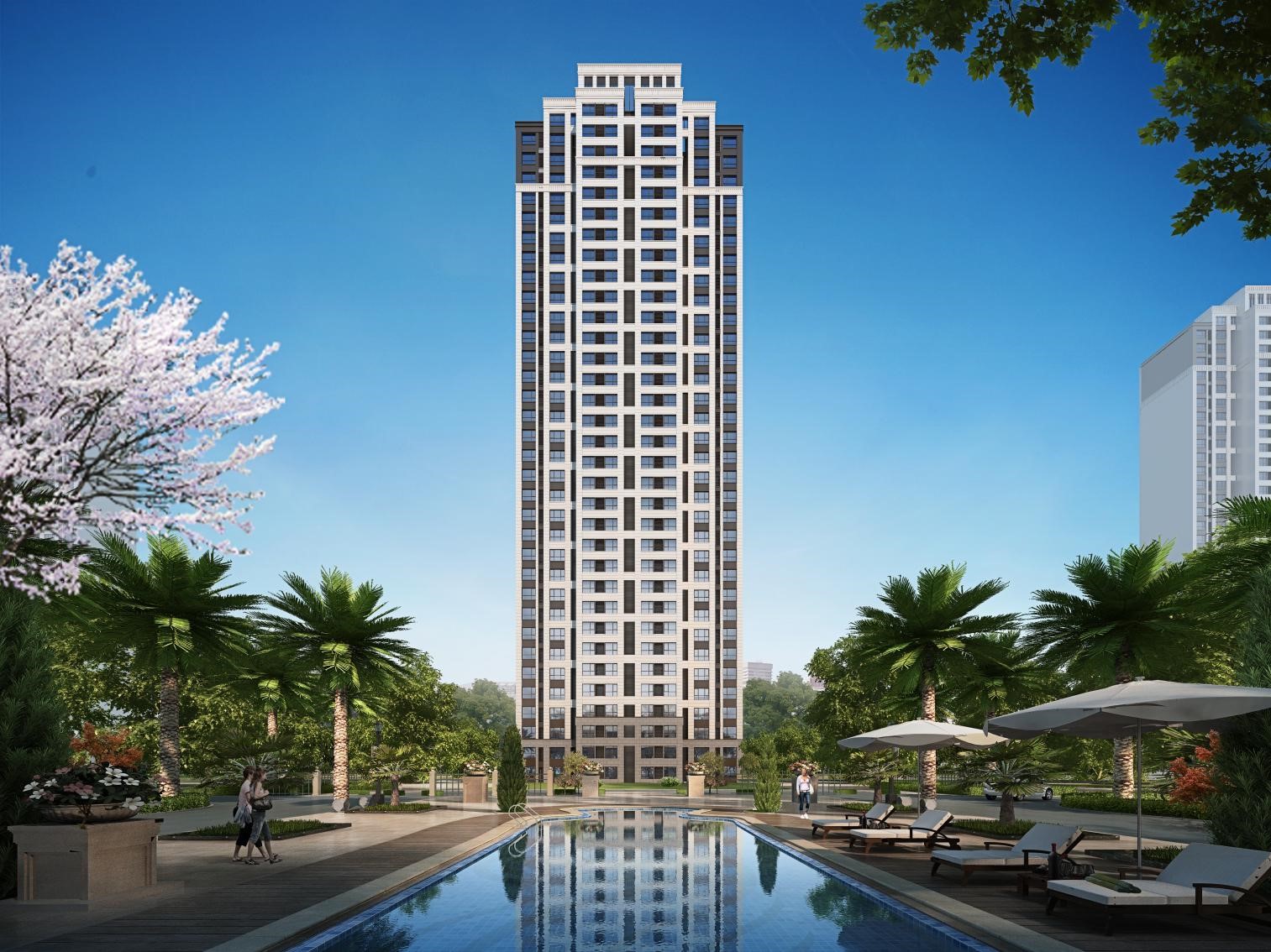 建筑风格方面,我院在设计时采用新古典的住宅风格,吸取文化精髓、强调温馨和谐、典雅尺度,造型稳重与古朴。整体造型简洁,细部丰富且精致,褐色、米黄色为住宅的色彩基调,营造温暖的宜居氛围。住宅造型采取三段式古典立面的处理方式,底层采取褐色真石漆,使得基座显得厚实稳重,中段及上部主要采用米黄色质感涂料,配以红褐色装饰线脚,使得细节层次更加细腻丰富,建筑顶部采用欧式装饰元素,使建筑整体看起来变化更加丰富,更具美感。在整个项目中,高层住宅是小区整体形象的营造者,在设计意象上,体现出简化的欧式特色,在设计中力求简洁大方,细部处理追求简约中的丰富变化。
